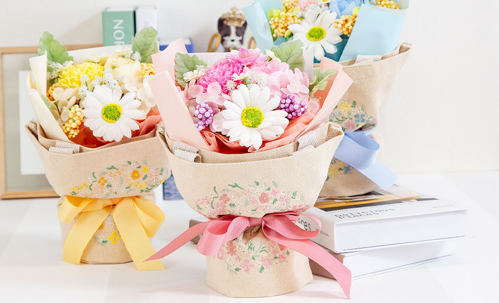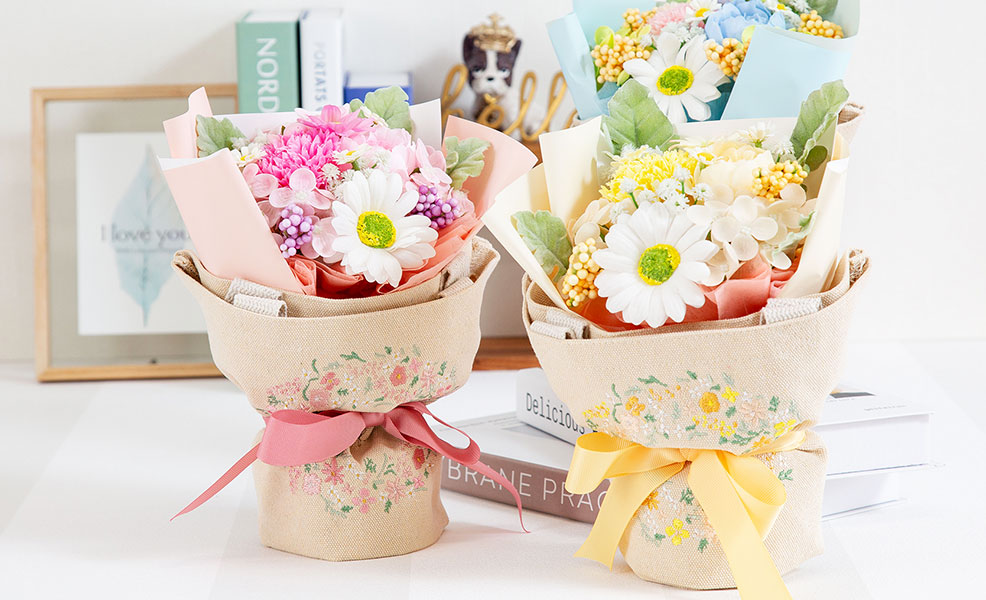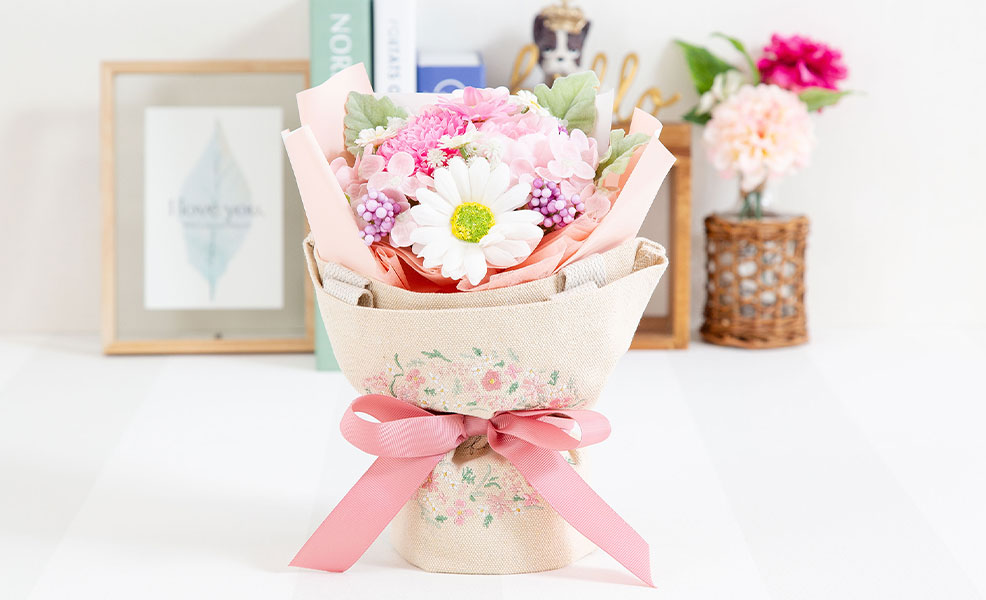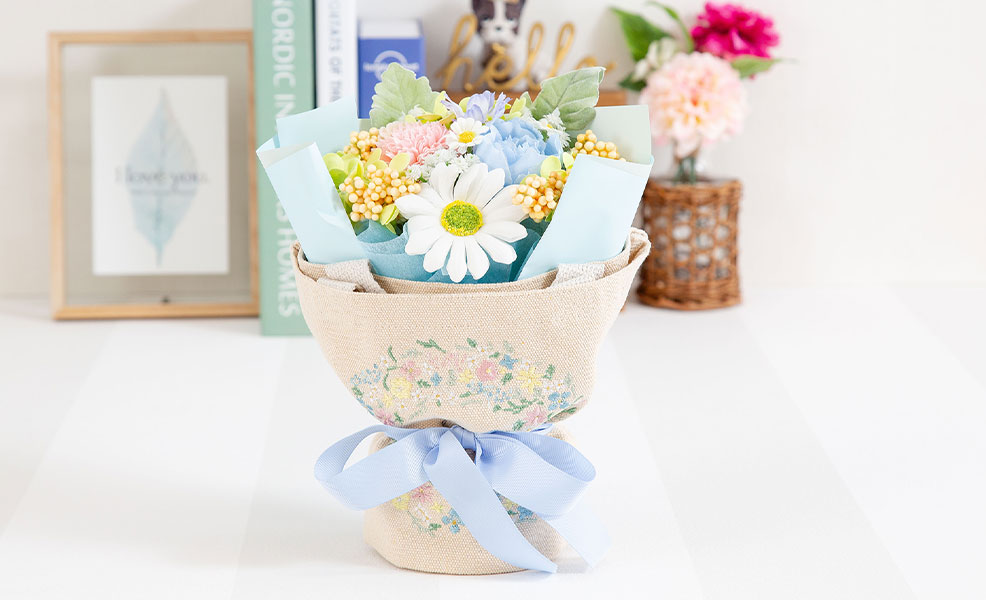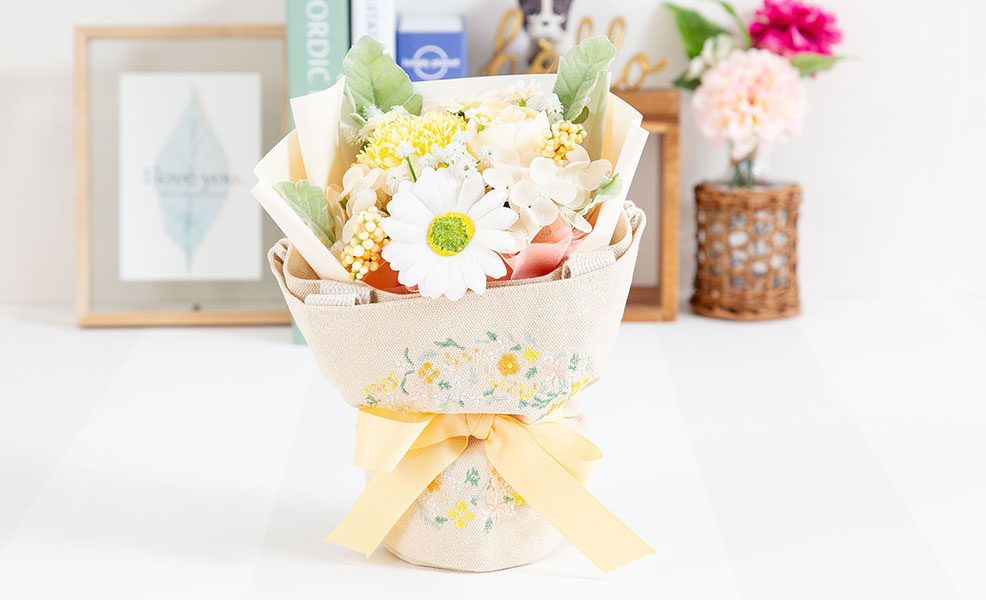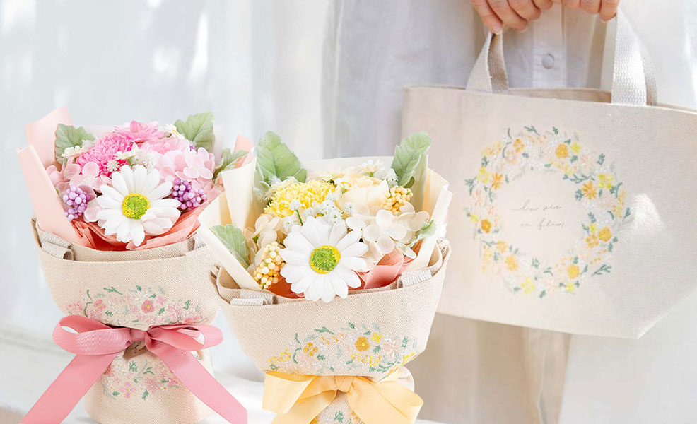 ラッピングにはそのまま使える優しくてかわいいデザインの刺繍をしたトートバッグを巻いており、お花で飾って、トートバッグも使える、便利なギフトです。
