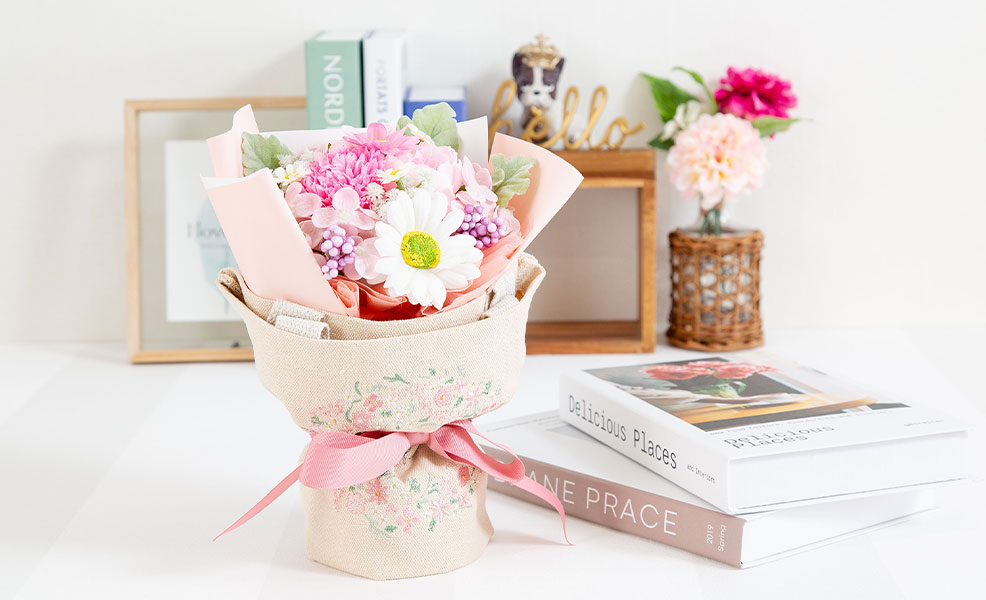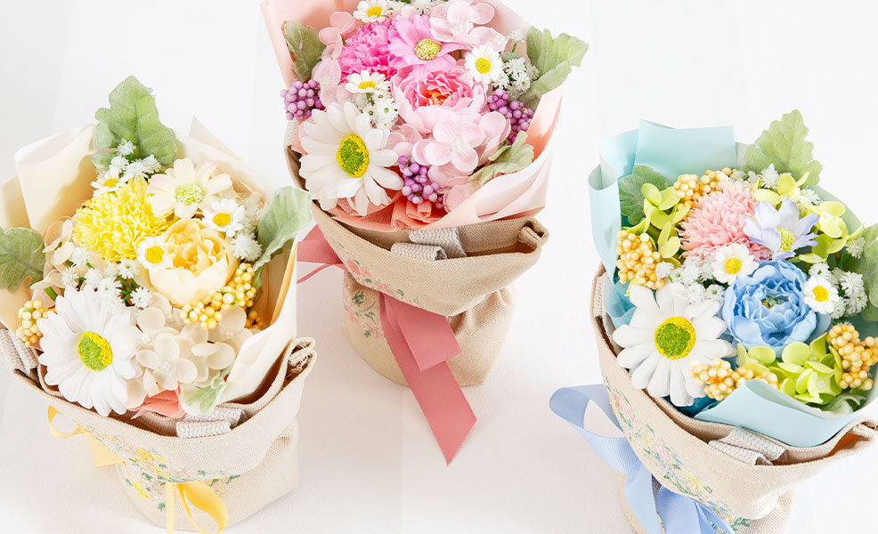 お花はソープフラワーと呼ばれる石鹸で精密にお花を再現した素材で出来ており、とっても良い香りがします。お手入れなども一切不要で、もちろんお水をあげる必要もありません。ソープフラワーの香りと、インテリアとして飾っていただく事で、長く楽しめます。