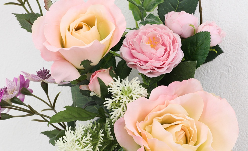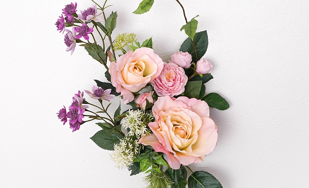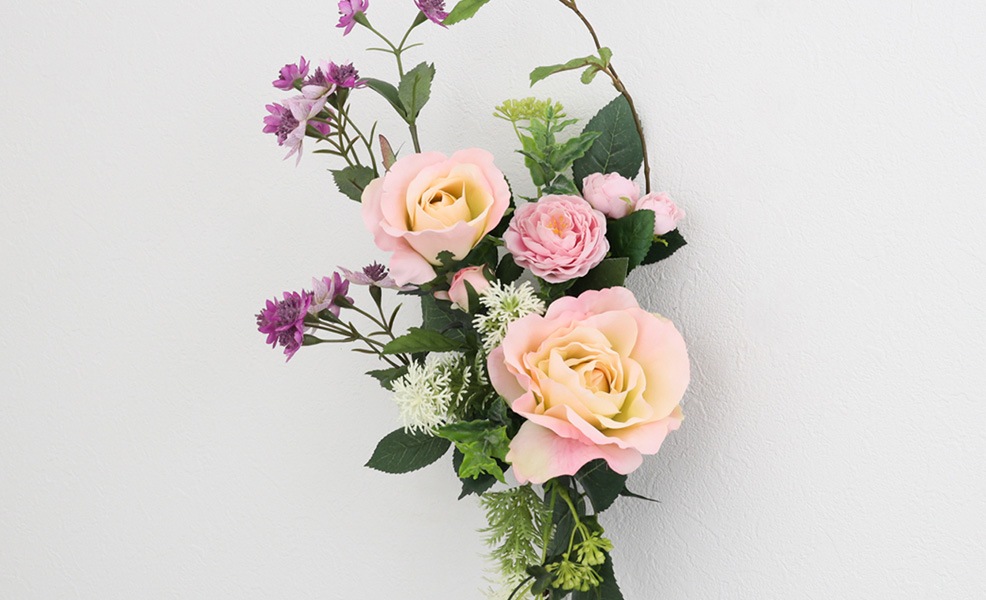 2種のピンクローズを組み合わせた可愛らしい壁掛けアレンジ♪
